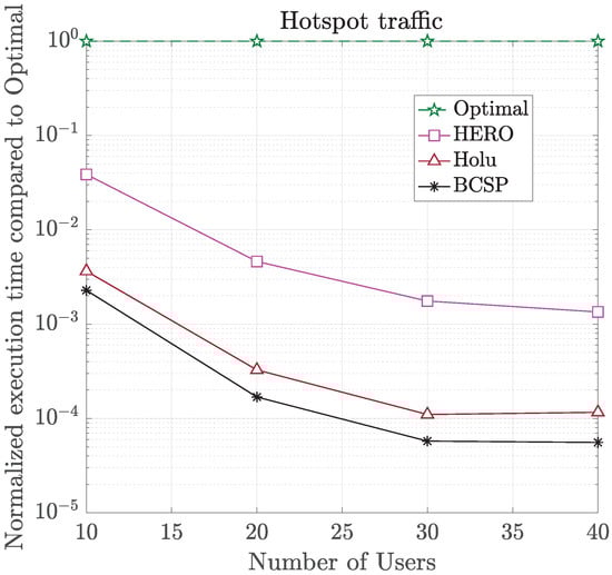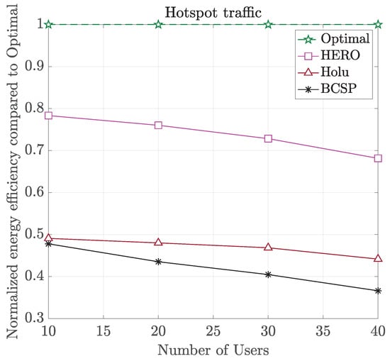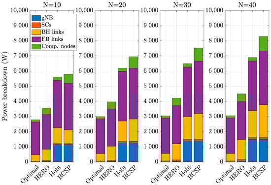 In Figure 6 and Figure 7, we show the normalized w.r.t. the Optimal solution of (17) energy efficiency (in bits/Joule) and computational time (in logarithmic scale), respectively, for all algorithms and different number of UEs. As can be seen, HERO provided a very good tradeoff between energy efficiency and complexity compared to the other approaches, achieving up to 78% of the Optimal value, with up to 742 times lower complexity. All algorithms had a 100% user acceptance ratio in all cases, except for BCSP which achieved 96% for N = 20, 93% for N = 40, and 91% for N = 40. This is due to the fact that in BCSP the CPU utilization of the computing nodes was not taken into account, resulting in less efficient VNF placement, which under higher traffic load could lead to a few UEs being blocked. The inefficiency of BCSP’s VNF placement is also shown in Figure 8, where the power break down of all algorithms for different number of UEs per gNB sector area is presented. As shown, inefficient BCSP VNF placement led to a higher number of deployed computational nodes, and thus, higher power consumption.