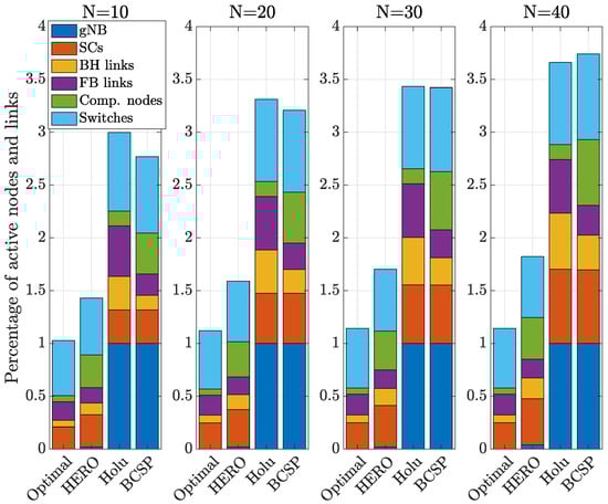 Compared to Holu and BCSP, HERO achieved up to 60% and 86% higher energy efficiency, respectively, while keeping the complexity low, as shown in Figure 7. This is due to the fact that HERO additionally considered user association as part of the optimization problem leading to higher flexibility at the expense of a little higher complexity. On the other hand, in both Holu and BCSP, the serving BSs were already decided (based on the best SINR criterion) and then the optimal VNF placement and traffic routing from the UE traffic source to its serving BS were performed. This is also demonstrated in Figure 8, where the Optimal and HERO did not deploy the gNB in any case but used SCs as serving BSs (in contrast to Holu and BCSP), hence, leading to much lower power consumption. We also observed that the power consumption of the Optimal and HERO were scaling better than the SoA with increasing load (HERO still achieved 68% of the Optimal energy efficiency value when N = 40).