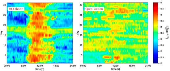 The refractive index structure constant is the most important index indicating optical turbulence strength. To better investigate the surface turbulence strength, dual timelines are chosen here to characterize the variation of . The comparison of the variation of between offshore and open ocean areas is depicted in Figure 2. In the figure, both the x-axis and the y-axis are time axes, respectively representing 24 h of a day and 30 days of a month. As shown in Figure 2, the refractive index structure constant has a relatively typical ‘seesaw’ feature near the ocean surface in the offshore area. The turbulence strength is stronger between about 07:00 in the morning and 18:00 in the evening, and weaker at other times, which is basically in the range of 10−17–10−12 m−2/3. The offshore experiment was mainly carried out in winter, and strong turbulence was measured during the daytime, which is consistent with the result of statistics estimated by Shikhovtsev [27]. Compared with values in the offshore area, over the open ocean in daytime, especially around noon, declines, in the nighttime increases, and is generally close to a constant value 2 × 10−14 m−2/3. The typical ‘seesaw’ feature disappears farther than 160 km from coast. According to the reference [27,28], the optical turbulence over open ocean is mainly controlled by air temperature gradient. It may be the result that the open ocean has lower air temperature compared with offshore during the daytime, which inhibits the development of turbulence. At night, the ocean surface temperature is higher than offshore, resulting in a larger temperature gradient, so the turbulence strength is enhanced. When the scientific research vessel is approaching land, the variation characteristics of are again consistent with the offshore area.