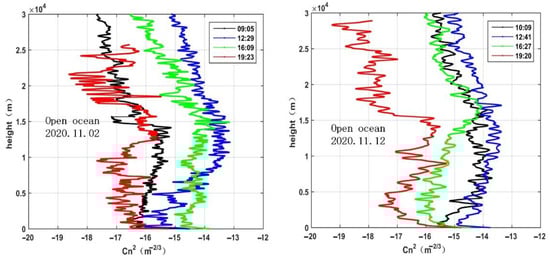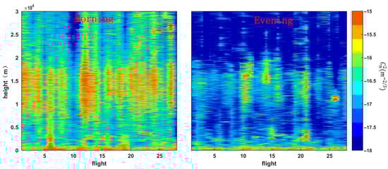 Similarly, the profiles of two moments, 7:40 in the morning and 19:40 in the evening, measured by the balloon-borne micro-thermometer over the offshore area are illustrated in Figure 4. In the figure, the x-axis and y-axis, respectively, represent the number of soundings and the height above ground level. Thirty profiles are displayed at every moment. Note that no matter whether morning or evening, the optical turbulence near the ground is strong, and there exists the strong turbulent layers from 10 to 18 km. With a comparison of the turbulence strength in the morning and evening, it is well visible that the value of in the morning is larger. It is notable that the differences in between morning and evening are relatively small near the ocean surface, but significantly large from 10 to 18 km. In the morning, the turbulence strength of the near-surface layer and the strong turbulence layer from 10 to 18 km are at the same magnitude. Compared with the morning, the turbulence strength near the surface in the evening is greater than the 10 to 18 km layer.