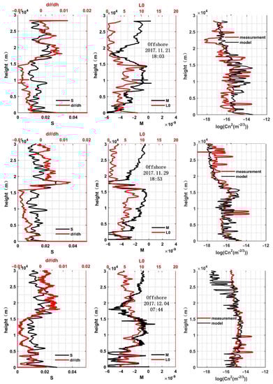 The profiles of temperature gradient, wind shear (left), outer scale, and potential refractive index gradient (middle), as well as profiles of estimated and measured (right) in offshore area.