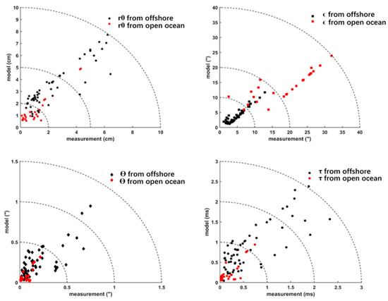 The integrated parameters (coherence length r0, seeing , and isoplanatic angle , coherence time ) derived from profiles are considered the main turbulence characterization parameters for astronomy and optical telecommunication [30,31,32,33,34]. The comparison of integrated parameters between the model and radiosonde is shown in Figure 8. For 532 nm light wave, the mean values from the radiosonde measurement are 2.45 cm and 1.05 cm at the offshore and open ocean, and the corresponding mean values from the model are 3.50 cm and 1.36 cm, respectively. Obviously, the mean from the radiosonde measurement at the open ocean is lower than the offshore area, which shows that the optical turbulence over open ocean is stronger than offshore. The result may be caused by our experimental site and the release time of the balloons. Contrary to , the of the open ocean is generally greater than that of the offshore, which once again verifies the strong turbulence over the open ocean. As shown in Figure 8, the of the open ocean and the offshore are similar, and most of the values are less than 0.5 arcsec. Furthermore, the characteristics of the coherence time and the coherence length are almost the same, which shows that the development of turbulence over the open ocean is faster than that over the offshore area.