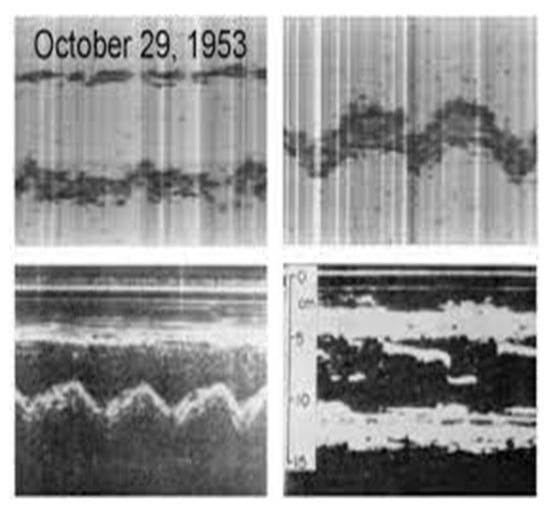 The first recorded ultrasound images of echocardiography from 29 October 1953 projecting in m-mode the walls of the left ventricle and the mitral valve.