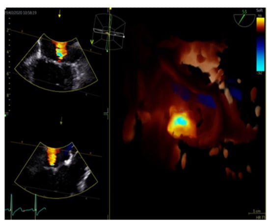 Three-dimensional image of the mitral valve along with color Doppler to visualize mitral regurgitation flow.