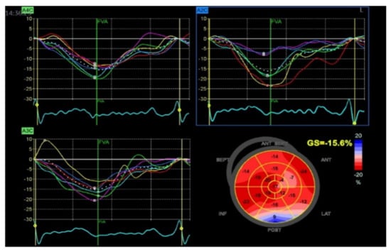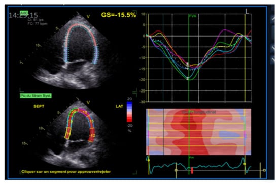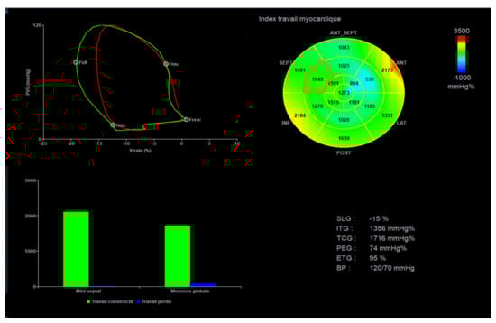 A new approach to cardiac mechanics and function that can overcome some of the limitations of the previously described techniques consists of a new imaging tool called myocardial work (MW). Non-invasive MW is calculated as the area of the pressure–strain loop, globally or for each LV segment [9,10,11]. Computation of the pressure–strain loop areas requires measurement of LV longitudinal strain using speckle-tracking echocardiography (STE), measurement of brachial artery systolic pressure by the cuff method, and setting of valvular event times that give us segmental and global values of myocardial work (Global Work Index: GWI). Several additional indices of MW are also calculated, such as constructive work (GCW), which is the positive work performed by a segment during shortening in systole and reflects the work that contributes to pump blood out to the circulation. Wasted work (GWW) can be calculated as work produced by a wall segment during lengthening in systole and during shortening in isovolumic relaxation. WW represents energy not contributing to blood ejection in the circulation. There is a slight difference between men and women where GWI is higher in women, and it increases with age. Only 5% of work is usually wasted in normal hearts. In other words, myocardial work and its indices are a tool for cardiac function efficiency and provide insight into myocardial energetics. In modern practice, it provides added value in the assessment of various cardiomyopathies and has proven utility in the assessment of patients who are recipients of cardiac resynchronization therapy (CRT) [12,13,14] (Figure 8).