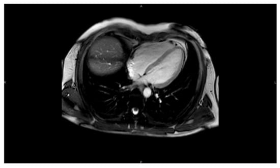 One of the main advantages of CMR over other imaging techniques relies on myocardial tissue characterization. T1-weighted sequences are very useful to visualize cardiac anatomy in great detail and detect the presence of intra-myocardial fat. T1 mapping can also quantify myocardial fibrosis [16]. For the detection of myocardial edema, the best modality is the use of T2-weighted imaging. Additionally, the use of contrast agents such as gadolinium can significantly increase the diagnostic capacities of CMR (Figure 9 and Figure 10). Late gadolinium enhancement (LGE) is a useful tool for the proper identification of infarcted myocardium. This technique is mainly used along with perfusion CMR to assess whether a wall region in question is ischemic or infarcted (scar) [17,18].