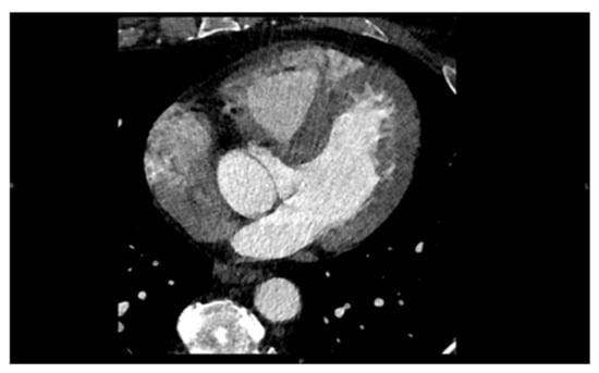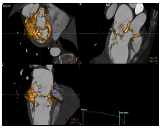 Cardiac computed tomography uses multiple X-ray beams emitted by a CT scanner rotating at very high speed and various angles in order to create cross-sectional images. The X-ray beams travel through the body, and they are collected by a detector array that can generate an image. Depending on the path of the beam through tissues of varying densities, a greyscale signal is created. Bone appears white (hyper-dense); the air is black (hypo-dense), blood and muscle are various shades of grey (Figure 11). Contrast is often used in order to enhance differentiation between tissues [21,22]. Coronary angiography also makes use of X-rays in order to visualize the heart vasculature without the need for invasive coronary catheterization. Via software post-analysis we can produce a three-dimensional image of heart vessels and evaluate atherosclerotic and stenotic lesions (Figure 12 and Figure 13). With computed tomography we can also visualize the accumulated calcium that is concentrated in different cardiac structures, such as the mitral annulus and leaflets, aortic cusps, pericardium, and coronary arteries, and quantify it via Agaston units or calcium score. For example, in aortic stenosis with the use of established thresholds of calcium score, we can differentiate between severe forms of the disease in special cases and choose the appropriate treatment for them [23,24]. Additionally, we can calculate the coronary calcium score (CAC), which according to the latest US and European guidelines can be used as a risk modifier in atherosclerotic coronary artery disease with incremental value in primary prevention [25,26,27].