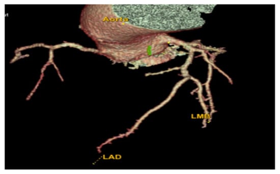 Computed tomography: 3-D reconstruction of the ascending aorta along with the three coronary arteries: left anterior descending (LAD), left marginal branch (LMB).