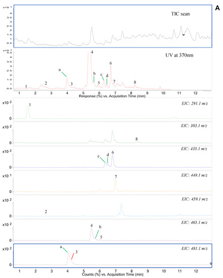(A) The total ion (TIC), UV, and extracted-ion (EIC) chromatogram in the positive scan mode, (B) The product ion scan (PIS) chromatogram of flavonoids in Syzygium formosum leaves (1-catechin, 2-EGCG, 3-myricetin glucoside, 4-myricetin rhamnoside, 5-muercetin glucoside, 6-muercetin arabinoside, 7-muercetin rhamnoside, 8-quercetin; peaks from a–d: unknown flavonoids).