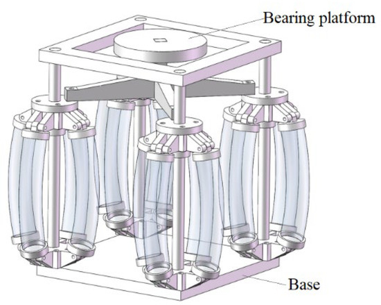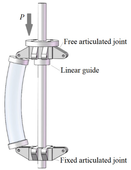 As shown in Figure 7, a post-buckling vibration isolator is constructed by 16 SGC units, a bearing platform, and a base. The fixed end of the SGC unit is connected to the base, and the free end at its top is connected to the bearing platform. Under the action of the four linear guides, the deformation of the proposed post-buckling vibration isolator is limited to a vertical direction.