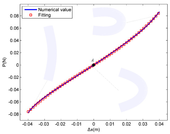 Considering the limited vibration stroke of the SGC for the post-buckling design, point A in Figure 3 is set as the initial position, while the upcoming applied load P0 = 0.33072 N is considered to be the initial equilibrium position. The recovery curve after numerical solution and fitting are shown in Figure 5. The post-buckling spring response force of a single SGC is expressed as