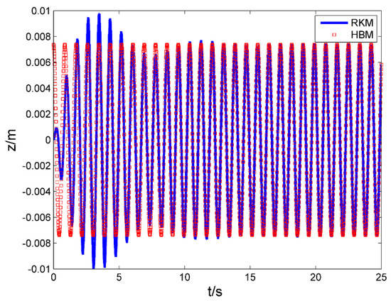 The numerical solution of the Runge–Kutta method (RKM) [30] is used to verify the accuracy of the HBM, and the parameter of vibration isolation system is selected as: m = 0.529 kg; ζ = 0.3; k1 = 33.9376; k2 = 76.0736; k3 = 6723.2; Λ = 0.05 m/s2; ω = 7.262 Hz. The analytical and numerical results of the vibration isolation system are shown in Figure 9, and the approximate analytical solution obtained by the HBM agrees well with the numerical solution obtained by the RKM.