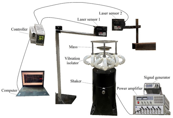 As shown in Figure 11, an experimental prototype was established to test the isolation performance of the SGC vibration isolator. This prototype includes seven main subsystems: a signal generator, a power amplifier, a shaker, the SGC isolator, laser sensors, a controller, and a computer. The shaker generates the forced vibration of the SGC system, which is applied to imitate a real vibration situation. The laser sensor measures the displacement of the base and bearing platform, which is used to evaluate the vibration isolation effect in terms of displacement transmissibility. The length, Young’s modulus, and section diameter of the SGC prototype in this experiment are 0.11 m, 3.5 × 104 Pa, and 0.035 m, respectively.