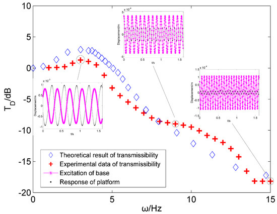Figure 12 shows a comparison of experimental and theoretical results of displacement transmissibility, and the vibration of the base and bearing platform are at the excitation frequencies of 3 Hz, 9 Hz, and 15 Hz after the system reaches a steady state. It is found that the experimental test results and the theoretical calculations essentially agree, and it should be noted that the experimental results in the low-frequency resonance region are slightly smaller than the theoretical results and slightly larger than the theoretical results in the high-frequency zone. This is caused by the insufficient accuracy of the installation of the physical model to produce additional damping. The effective vibration isolation frequency of the SGC vibration isolation system is about 4 Hz. As the frequency increases, the inhibitory effect of the vibration isolation system on the vibrational transmission gradually increases. When the excitation frequency increases to 15 Hz, the amplitude of the steady-state displacement has the ability to decrease to 18 dB.