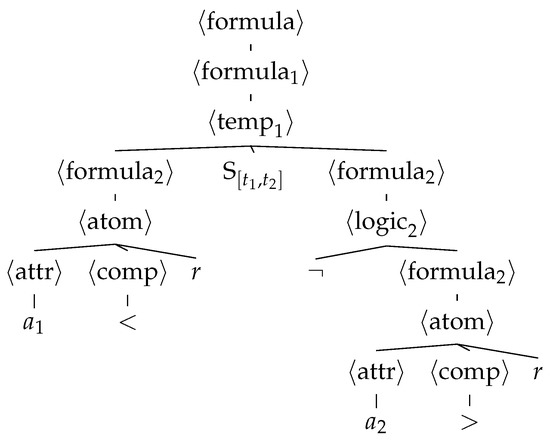 Figure 2 shows the grammar for STL formula structures with limited nesting of the temporal operators. The figure adopts the common Backus–Naur form: the non-terminal symbols are enclosed in angle brackets, whereas the terminal symbols are shown as literals (¬, ∧, …, r, , , …, <, >, 0, …, 9); for each non-terminal, derivation rules are separated by |; the starting symbol is the topmost non-terminal, i.e., . The terminals , , …, derived from the non-terminal , represent the attributes of the problem at hand: in this way, the grammar is tailored to a specific problem. For brevity, we express some of the non-terminals using a parameter i that represents the maximum nesting. The only derivation rule that increases i is the one for , which represents (partial) formulas with temporal operators. The limit to nesting is enforced by the parametric definition of the derivation rule of , that does not expand to if . In this study, we set the maximum nesting to . This means that CFGGP operates on a grammar that is the realization of the grammar of Figure 2 with and a given set of attributes A.
