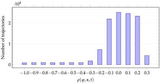 From Figure 5, two observations can be made. First, robustness values cluster around . Second, robustness values cluster symmetrically. Table 1 corroborates these observations. Recall from Section 4 that our goal is to mine formulas that are tight since tightness is of fundamental importance when no labels are provided. Formulas are tight when robustness values are as close to zero as possible, in particular , with a small quantity, which depends on the system at hand. In other words, formulas must fit the pool of trajectories at hand and in such a way that small perturbations make the robustness value greater than on some trajectory. By looking at Figure 5, we remark that the mined formulas are indeed tight. Let a value be fixed. The best individuals produce robustness values that fit into a segment centered in and of length ; that is, they lie in . Choose an adequate value for , e.g., . From Figure 5, we notice that the vast majority of values lie in . Recalling our definition of tightness of a formula from Section 4, these results confirm that the best individuals indeed are tight formulas.