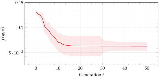 We ran an experimental campaign with the aforementioned parameters. To evaluate whether our approach is effective, we (1) verify whether it evolved tight formulas, and (2) compare the fitness f of the best individuals with that of randomly initialized formulas. For the former, Figure 5 plots the histogram for the distribution of for the best individuals found in each run (i.e., the individual having the lowest fitness f at the last generation) and for all the car trajectories . For the latter, Figure 6 reports median ± standard deviation fitness f over the course of evolution for the best individuals found in each run. Table 1 summarizes (with median ± standard deviation) the results in terms of fitness f and for the best individual found in each run, as well as evolution time (in seconds).