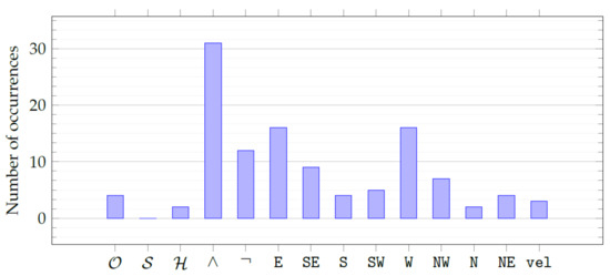 By manually inspecting the best individuals and visualizing the aggregate frequencies with Figure 7, we found that all the attributes are present, with a slight overabundance of and that are, respectively, the distance from the front neighbor and the distance from the rear neighbor. Moreover, evolution prefers the ∧ and ¬ operators over the temporal operators (of which there is approximately one per formula). This finding is in line with our expectations since temporal operators are likely to be the least interpretable for a human (as confirmed for mathematical expressions in [23]).