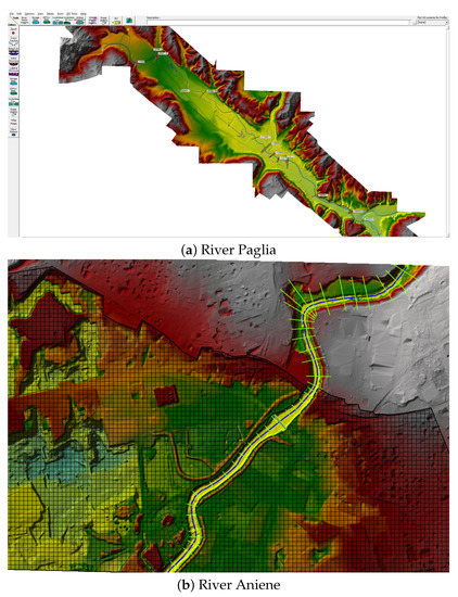 This model is implemented in the latest version of HEC-RAS, i.e., version 5.0.7 (as at the time of writing this article), which allows for setting the geometric data of the river in the convenient form of ‘geo-referenced’ files. Typically, these files follow the DEM (Digital Elevation Model) file format, as graphically shown in Figure 1. Setting the geometry for the simulation is an important step, which has to be concluded with implementing adequate upstream and downstream boundary conditions. The coordinate of the cross-sections of the river must be too defined by entering both the river station and elevation points from the left to the right bank in sequence along the river. A different number of cross-sections are allocated along the the two rivers in this research: