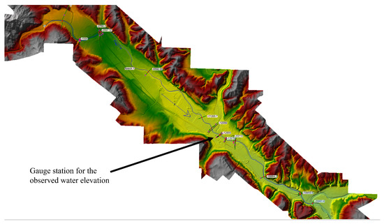 At this point, the model can be used. Internally, HEC-RAS uses an empirical Manning’s equation to simulate the relation between the river discharge, hydraulic resistance, river geometry, and friction energy loss. This has the form reported in Equation (3)