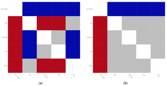 Moreover, for the purposes of the meta-heuristic research field, we also analyse the effectiveness of all the five competitor meta-heuristics. With this aim, the pairwise comparisons among the results of the meta-heuristics provided in Table 1 and Table 2 were statistically validated by means of the Kolmogorov-Smirnov (KS) statistical test [54]. Hence, by considering a significance level of 0.01, the results of the KS tests carried out are depicted in Figure 7a,b for, respectively, the river Paglia and the river Aniene. Each figure is a heatmap where a red square is used to indicate that the corresponding column-algorithm significantly outperforms the corresponding row-algorithm; a blue square means that the row-algorithm is significantly better than the column-algorithm; a grey square is used if there is no statistical difference between the two algorithms.
