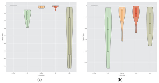 The empirical probability density functions of the final fitness values obtained by the 25 executions of any single algorithm are depicted in the violin-plots of Figure 8a,b for, respectively, the river Paglia and the river Aniene.
