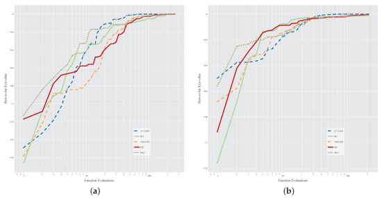 Average convergence graphs of the algorithms’ best-so-far (abscissa is in log-scale). (a) Case study 1—River Paglia; (b) Case study 2—River Aniene.