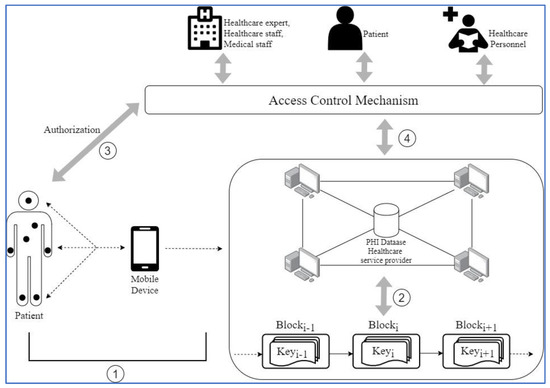 Figure 1 shows the authorization and access control of the proposed medical care information system. Patients’ health data may be held by various medical organizations, such as hospitals and clinics. All users, which may include patients, healthcare experts, healthcare staff, and medical staff, must be able to request patients’ health records within the medical care information system. Patients’ health data are stored in the PHI database of the healthcare service provider, which exploits the non-tampering feature of the blockchain, as follows.