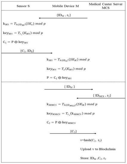 - Confidentiality: During the data upload stage, the mobile device and medical center server do the Chaotic Map-based Diffie Hellman Key Exchange to generate key , , , and . In the process of data transmission, the data transmitted are all encrypted data , and to ensure the confidentiality of patient data;