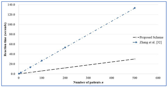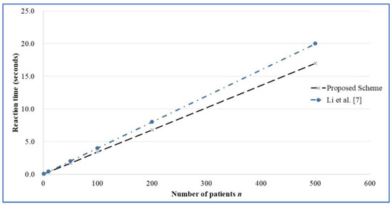 The method that is proposed herein is compared with those proposed by Li et al. [7] and Zhang et al. [32] in terms of computational complexity and response time. For a detailed analysis, refer to Table 3 below. The simulation environment and test results are listed in Table 4 below. The mechanism that is proposed herein uses only light-weight computing techniques such as chaotic mapping and the hash function. The required time and computational complexity in the sensor data transmission stage are less than those of the elliptic-curve point multiplication that is used by Zhang et al. [32]. Figure 4 displays simulation results concerning the response time in the sensor data transmission stage in the scheme of Zhang et al. [32] and proposed scheme for n = 1, 10, 50, 100, 200, and 500. In the social network information transmission stage, the data encryption and decryption are more efficient than those associated with the symmetrical formula of Li et al. [7] Figure 5 displays simulation results for the reaction time of social network information transmission stage of Li et al. [7] and proposed scheme for n = 1, 10, 50, 100, 200, and 500.