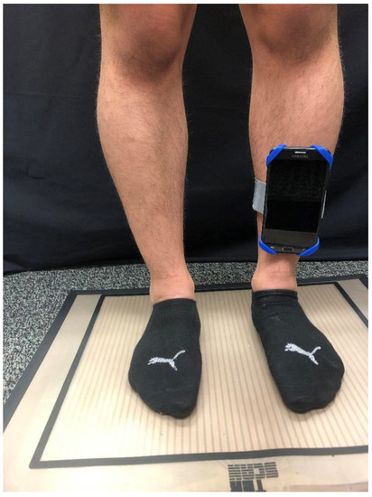 Each subject stood with their arms at their side, relaxed, shoes removed with socks in the middle of the force plate, equidistant to its edges. Each subject was allowed to select their own foot placement on the force plate, since it has been shown that self-selection of foot placement serves to stabilize posture [15]. The subjects had a phone attached with a Velcro strap to their left tibia (Figure 1). All of the available literature cited in this paper relied on the smartphone being placed in the areas of the hip, lower back or breast of the subject. Similar positions were tested during preparation for this research, and it was found that these positions could not faithfully represent the position of the body’s center of pressure, since during sway one tends to bend the body at the hip and knee joints to maintain better equilibrium; therefore, the tibia position was selected, as shown in the Figure 1.