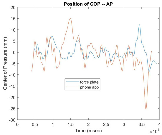Typical plots of the position of center of pressure (COP) in the anterior-posterior direction as calculated from the data acquired by the force plate and the phone application.