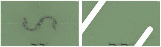 Meshing was done in ANSYS Meshing software. The static body that simulates the far fluid field has a structured mesh with only quadrilateral elements, while the mobile body that simulates the field near the rotor has an unstructured mesh with predominant quadrilateral elements and some triangular elements to achieve greater adaptability to geometry (Figure 5 left). The mesh adjacent to the rotor walls is refined and has a perpendicular layer structure (inflation) that allows a better prediction of the boundary layer (Figure 5 right).