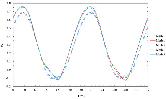 Torque coefficient () according to azimuth () for each mesh.