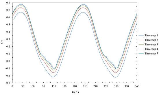 Starting from the fourth meshing, the temporal discretization independence analysis is carried out in the same way, under the same conditions, and for the same geometry as the meshing independence analysis. Five time discretizations are taken, generated by dividing the period of the rotor’s revolution into a number of elements or time steps. The results obtained in this analysis are shown in Figure 7 and allow estimating the average value of for each temporal discretization (Table 4). It is evident that the variation of the averaged decreases as the partition tightens, getting closer and closer to a convergence value that is supported by an asymptotic convergence indicator of 1.0281 for Richardson’s extrapolation. A discretization of 720 time steps per revolution is then determined, which represents a suitable relationship between the allowable error and the simulation time.