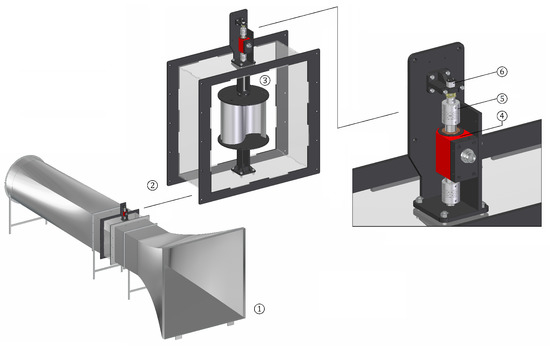 Schematic of the experimental setup: (1) wind tunnel, (2) test section, (3) test model, (4) torque sensor, (5) couplings, and (6) braking electric motor.
