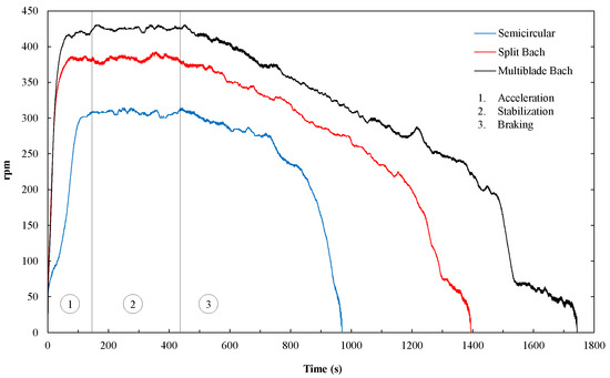 The flow inside the tunnel accelerated the rotor from zero velocity to its limit velocity without load. Once the rotation regime stabilized, a power signal was sent to an electric motor, which was constantly increasing its intensity. The load exerted by said motor made the test rotor brake until it was completely blocked (Figure 11).