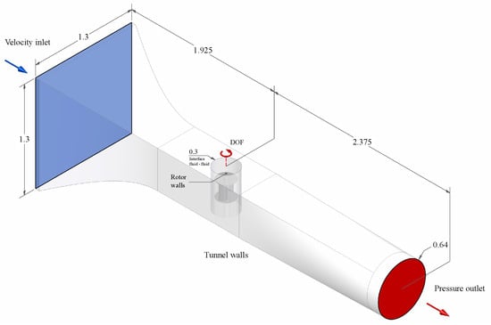 The purpose of the experimental study is to validate the results obtained from the numerical analysis rather than to approximate the real performance of the rotor. Therefore, in order to compare the results obtained experimentally with the numerically estimated data, it was necessary to replicate the experimental conditions within a three-dimensional numerical model formulated according to the system’s degrees of freedom (6-DOF solver). In this regard, the blockage ratio within the wind tunnel does not represent a variation factor between both approaches.