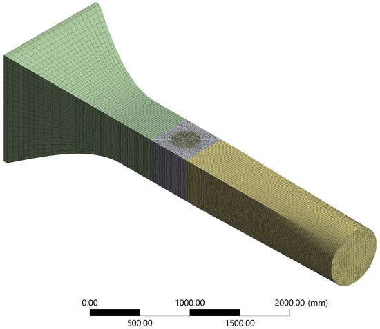 An air inlet is established at a velocity of 4 m/s (class 1 wind) [35], corresponding to a flow regime with a Reynolds number of . Similarly, an output to atmospheric conditions is set and the lateral field is simulated under symmetry conditions since there are low-scale gradients [32,36] (Figure 3). However, established boundary conditions can make it difficult to deflect flow around the turbine as opposed to the restriction produced by the turbine, thus generating a blockage effect [37]. This produces an acceleration of the flow around the obstacle and means an over-prediction of the rotor’s performance [38].