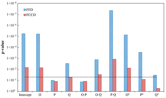 The results of the Fisher test F global allow one to conclude with full confidence that the analyzed data respond to a trend and, therefore, can be modeled (p-value = 1.332 for the FFD and p-value = 3.9 for the FCCD). A second-order multiple regression model with interactions is adjusted for each experimental design, with which the effect of the different factors is determined. The null hypothesis of the test establishes that the analyzed factor has no effect on the response variable. Therefore, the lower the p-value of each coefficient, the greater the evidence against the null hypothesis, suggesting a significant difference generated by the respective factor [42]. Table 8 summarizes the results of the variance analysis (ANOVA) for the adjustment of the regression models of the FFD and the FCCD.