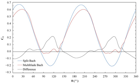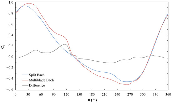 To understand the aspects that led to this result, the variations in the aerodynamic behavior of the blade when implementing secondary elements are analyzed. To do this, the in one of the blades of each rotor is determined as a function of , at a rotation velocity of 7 rps (), corresponding to the maximum performance of the Bach type profile for the 2% blockage ratio (optimal velocity decreases to convergence by reducing blockage effect). This is done under the simplification that the two blades that constitute each rotor have similar and counter-phase performances.