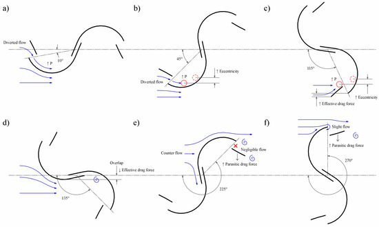 As the blade approaches the position of greatest resistance (Figure 20f), the secondary element begins perceiving a slight flow, which, when deflecting it toward the concavity of the main element, allows it to counteract the additional resistance that this means, and makes the difference between the performance of the two profiles remain close to zero. In this way, it once again achieves a position in which it gets to divert a sufficient part of the flow to replenish with profit the losses that will be generated during the next cycle (Figure 20a).