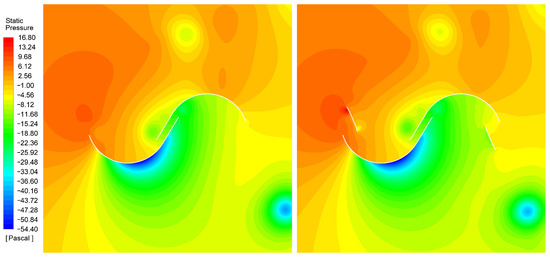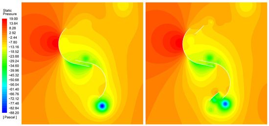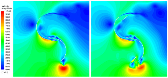 In the contour graphs, the states of pressure and flow velocity through the geometries being studied are presented. In Figure 22, it can be seen that the pressure on the concave side of the advancing blade is higher in the multi-element profile than in the profile without secondary elements, when the rotors are in the position of the greatest advantage in performance. This higher pressure also induces a slightly higher flow through the gap generated by the profile’s splitting (Figure 23).