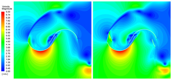 Velocity contour graphs for the split Bach profile (left) and the multi-blade Bach profile (right) at a rotor azimuth angle () of 115° and a of 1.0996.