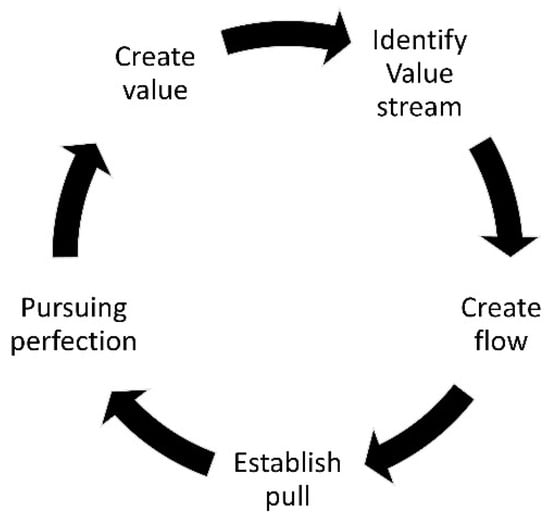 For more revenue, investment increase, and cost reduction, the competitive presence on the rising international market, the lean methodology for manufacturing is working over all parts of the value stream to decrease or reduce the waste. Value streams are activities needed to be planed, ordered, and supplied for a specific product or value within a supply chain [15,16,17,18,19]. Agility in production, just-in-time production, synchronous production, world-class production, and continuous flow are concepts used in contrast with lean production, which helps reduce costs by continuous improvement, so the cost of services and goods are reduced, thereby profits are increased. The purpose is to remove waste or its reduction (“muda”, the Japanese word for waste) [20,21] and to achieve a maximum or optimization usage of the tasks. The added value is given from the consumer perspective and drives quality, which equals consumer desire or willingness to pay for the product or the associated service following their viewpoint cycle is reflected in Figure 1.