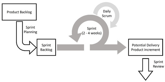 The methods are incrementally helping the product development in short iterations, delivering regular product releases to their stakeholders or the end customer, with emphasis on small teams [3,4,13]. The scrum process is portrayed in Figure 2, which shows the iterative character with the circles. The big loop or sprint reflects the short periods in which the product is developed incrementally in small parts and after passing through a reviewed process to check the ready status to be released to the customer or user. The daily meetings, small loop, are kept ensuring the information flow within the team, to update them, and discuss the project progress or current issues [23].