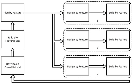 Within Agile the Feature Driven Development is a highly adaptive model that is focusing on quality during all development life-cycle and project phases. A feature is a valued function that the end-user wants in the software [25,26], usually can be extended toward system goal as a value delivered, focused mainly on design and delivery phases. Frequent outputs are the expected and testable results that provide progress and status information for the project; the process is shown in Figure 3.