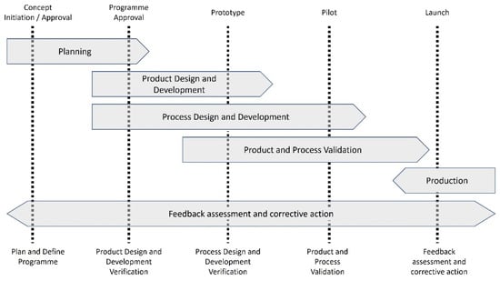 Advanced Product Quality Planning (APQP) is the development methodology used mainly by the automotive industry to align on a set of procedures and generic templates to reduce the amount of time spent on documentation and to be able to re-use cross-products the documentation when possible [9]. The methodology was created by Chrysler, Ford, and General Motors, USA companies, to provide guidelines for developing a product quality plan that supports the development of a product or service that will satisfy the customer [9,10,11].