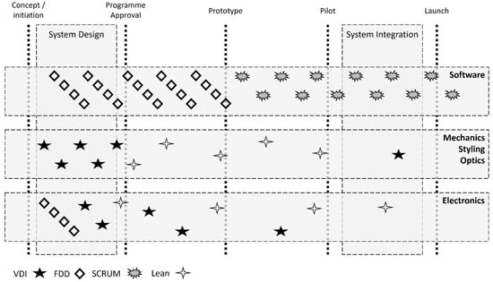 The development approach or model based on the standard backbone of the APQP, shown in Figure 6, helps to ensure the quality management process used for each engineering activity with the appropriated development processes, which are to have a minimal impact and the minimum cross-impact towards other development activities. Mechanics, styling, and optics have been mainly within the same engineering core, one is hard to be modified without impacting others (except hidden areas); hence, it is necessary to use the same approach for the development cycle. The system design and system integration can be done with different software versions or electronic engineering parts (fast-prototypes), can follow their development cycle, whereas the software another cycle and meet the integration targets converged within a mature product.