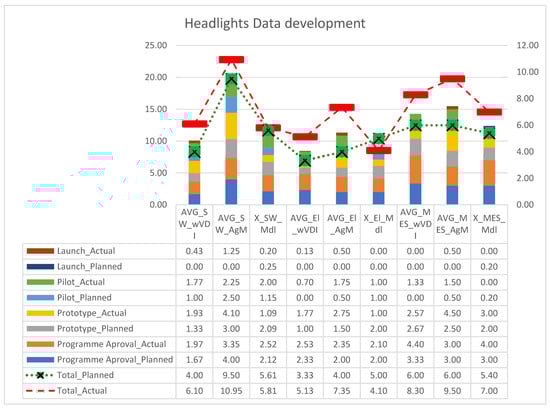 Data gathering and requisition were based on LED-based headlights with dedicated controller units to cover the volume of features required by the proposed methodologies. Figure 7 reflects the orientation and data for this model proposed. The headlights data development is covering each APQP milestone with planned and actual delivery required to achieve a minimum viable product. Major iterations were denoted with integer values, whereas the small iterations, which had no cross-domain impact, were denoted with fractions. This was performed for each major activity SW (software), El (electronics), MES (mechanical and optical engineering system) on projects that followed VDI methodologies and Agile methodologies (AgM). X denotes the assumed model expected behaviour. The planned total was added to the graph to reflect the deviation from current projects.